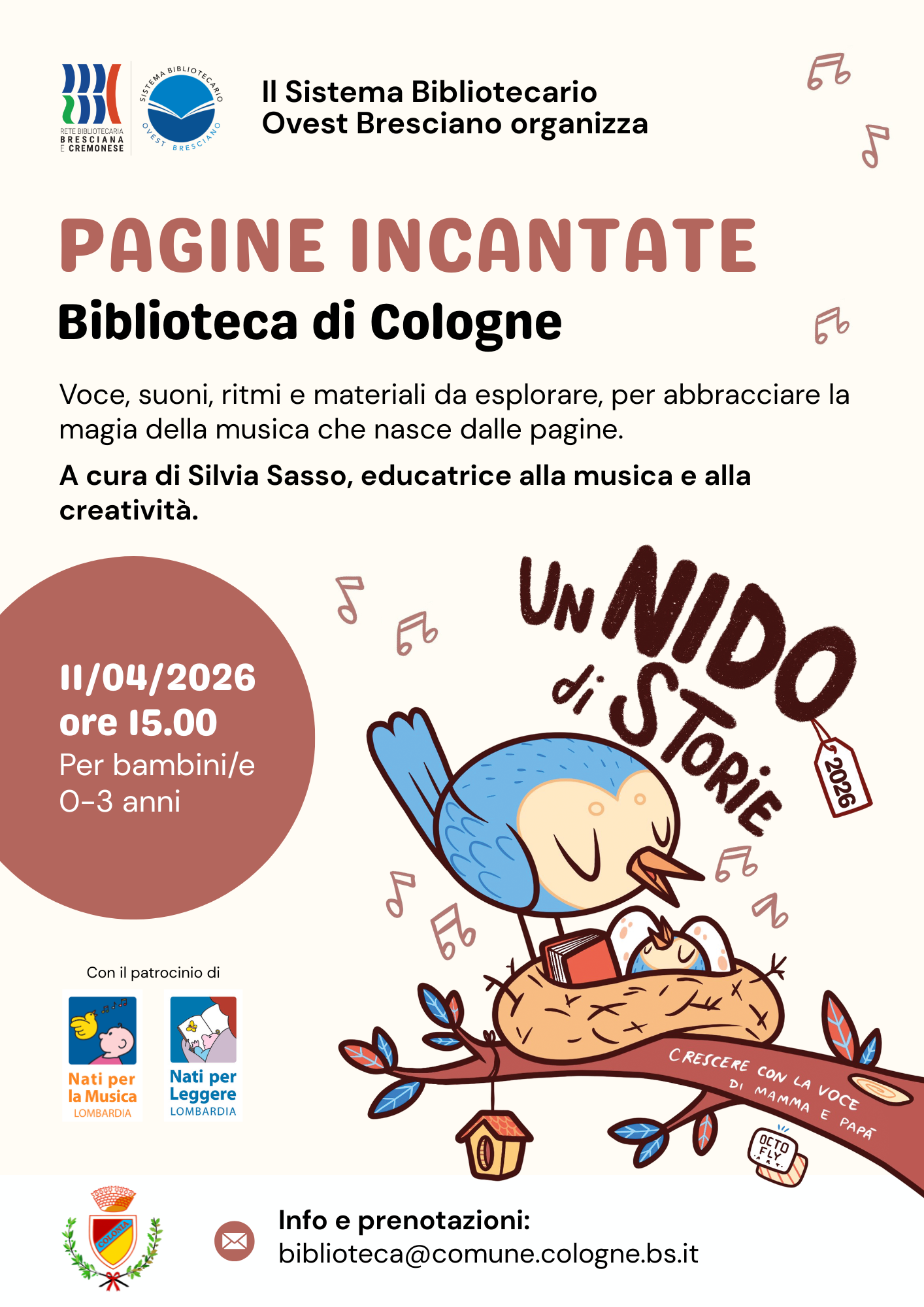 On Saturday April 11th at 3.00 pm, the “Pagine Incantate” reading workshop will be held at the Cologne Municipal Library, dedicated to children aged 0 to 3, as part of the “Un Nido di Storie” series.